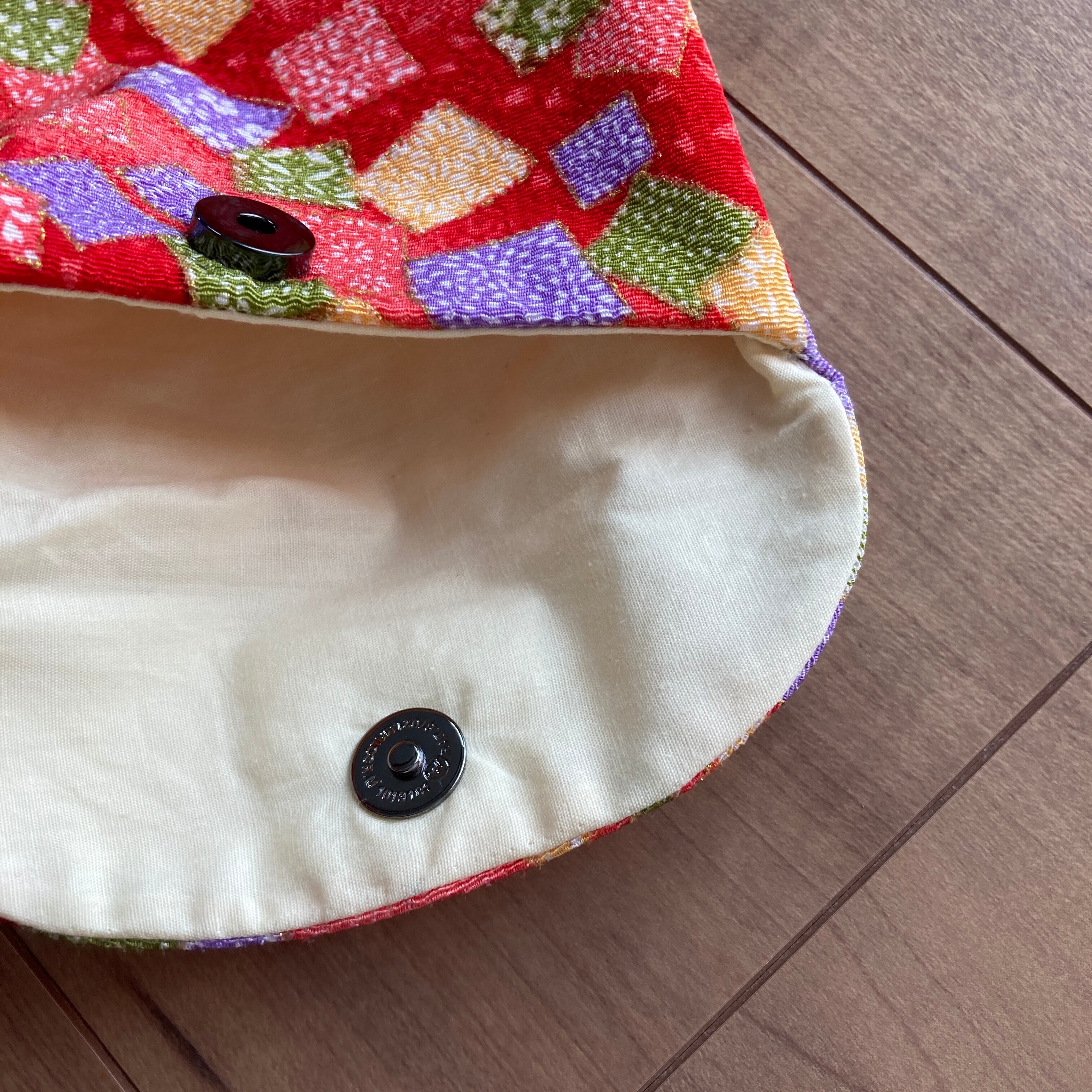 留め具のコハゼが手に入らなかった為、マグネットボタンを使用しています。